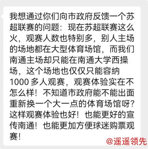 南通网友嫌弃主场座位太小,对有关部门提出换大场地的建议。