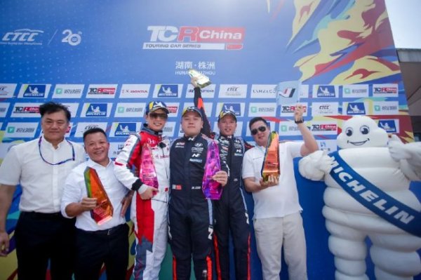 2023 CTCC中国汽车场地职业联赛湖南株洲站第一回合颁奖台 7月9日,2023 CTCC中国汽车场地职业联赛湖南株洲站再献两回合精彩对决。超级杯-TCR中国系列赛、运动杯-长三角赛车节两大赛事总计44台赛车,近60位车手无惧热浪考验,再度上演标杆级职业对决。12000名车迷亲临现场共赴热爱,见证了这场血脉喷张的终极博弈。黄金联赛为株洲的体育文旅再添美好记忆。 在上午的首回合交锋中,Hyundai N车队的曹宏炜发车后一击制胜,夺取个人TCR中国系列赛第三冠;来自东风本田车队的谢欣哲和Z.S...